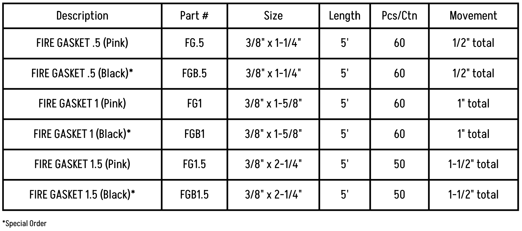 Fire Gasket is available in three sizes, with 1/2″, 1″, and 1-1/2″ total movement.